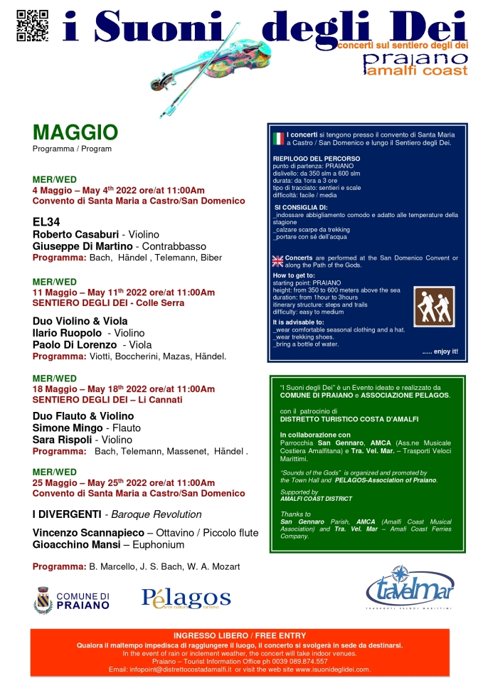 L’evento I Suoni degli Dei prenderà il via il 4 maggio prossimo presso la piazzetta del Convento di S. Domenico a Praiano, con la performance dei maestri Roberto Casaburi (violino) e Giuseppe Di Martino (contrabbasso), anche conosciuti come EL34, con un programma che spazierà da Bach a Händel.